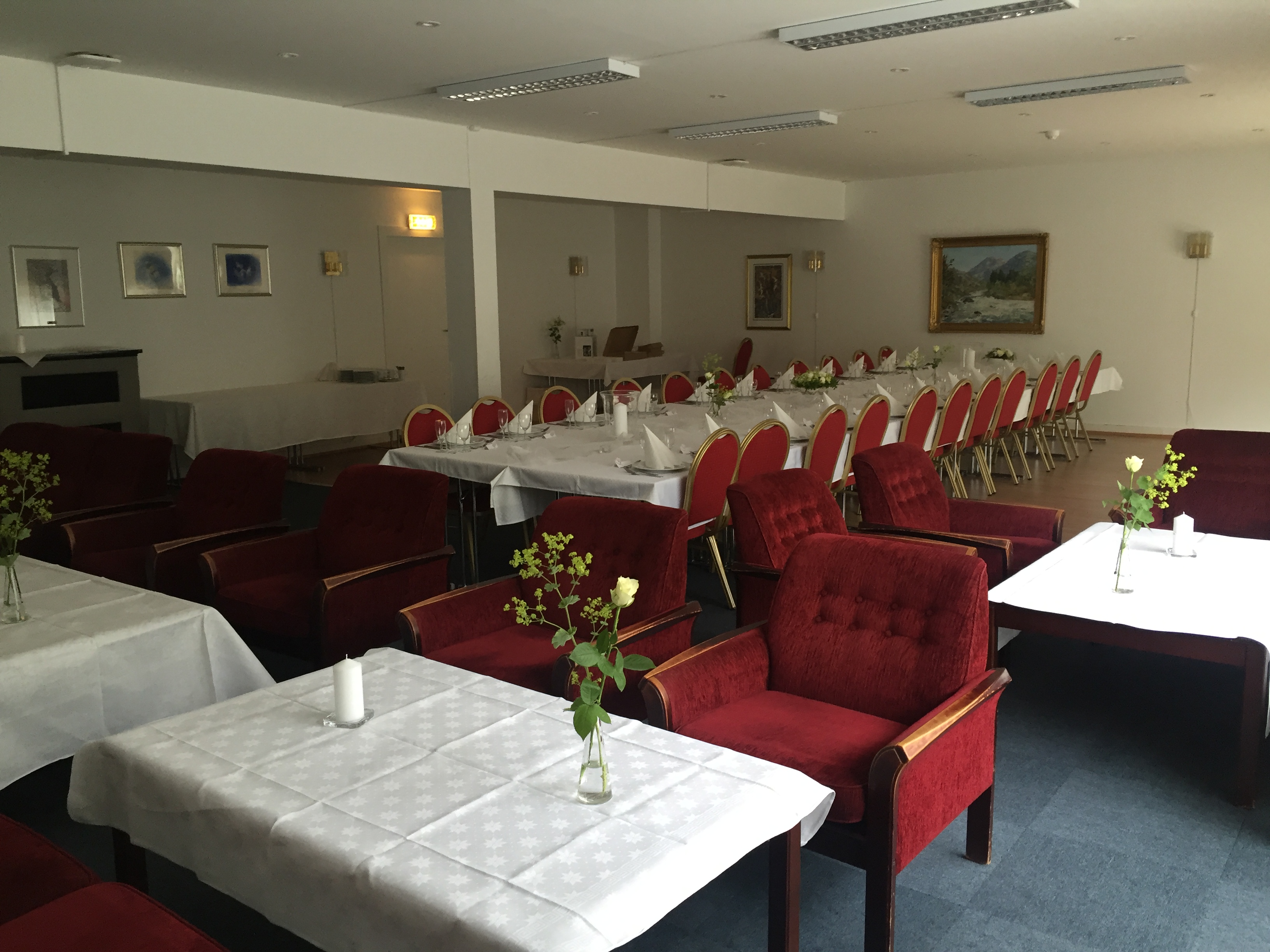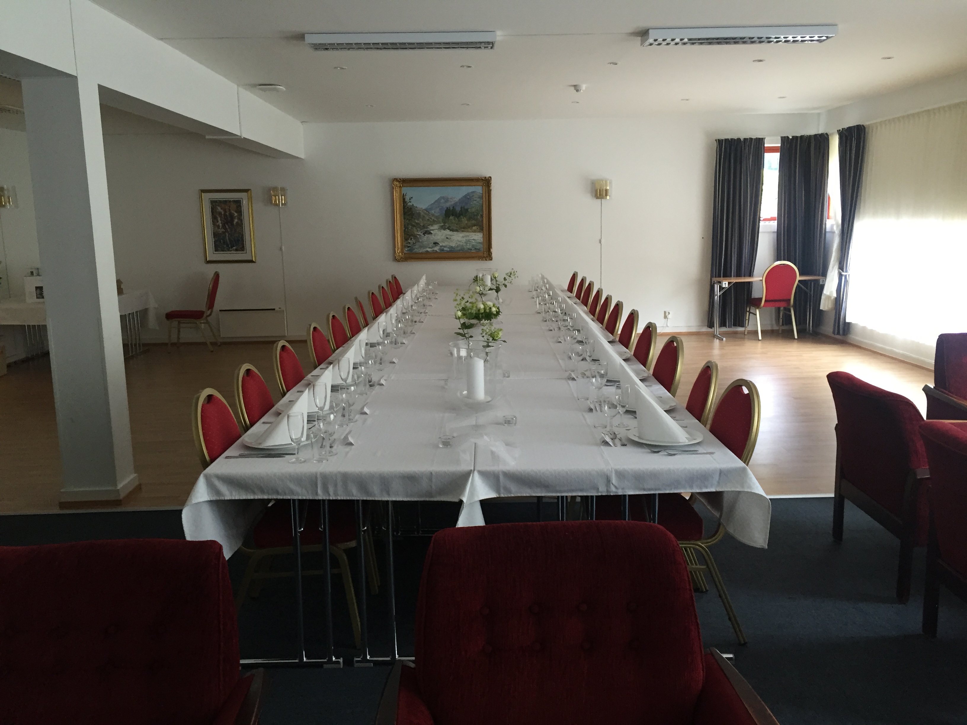 Dekket bord og salong i 2. etasje for bryllup med 22 personer.