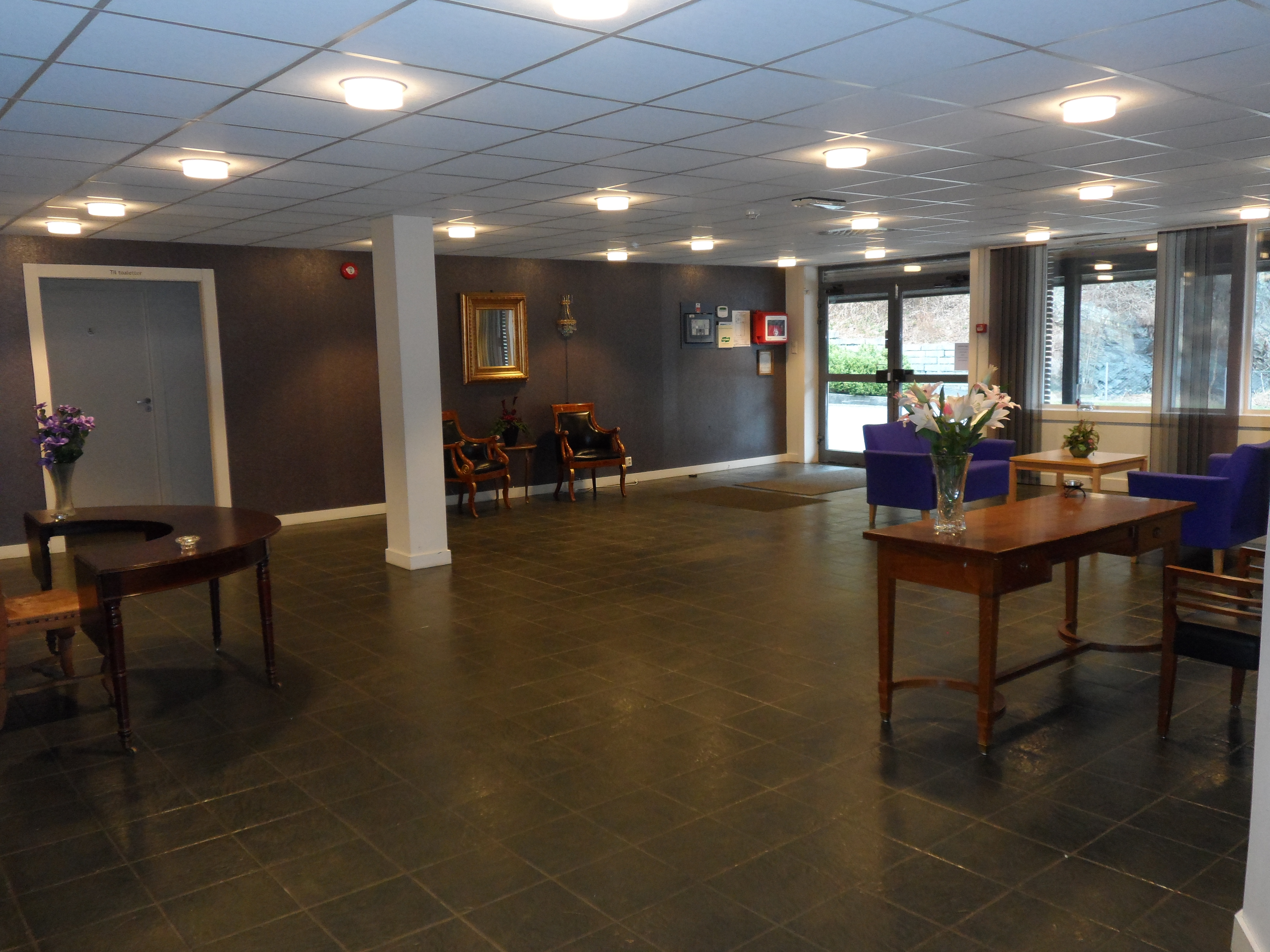 Foajeen i 1. etasje med inngangsparti, her er det rikelig plass til å ta imot og ønske gjester velkommen.